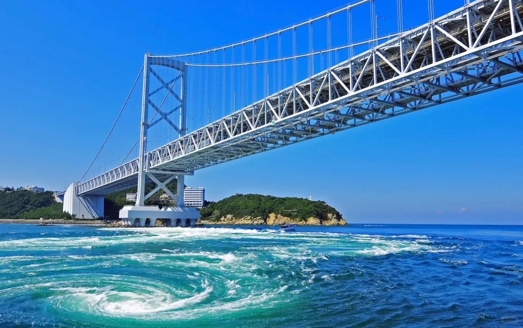 大鳴門橋遊歩道「渦の道」は、大鳴門橋の橋桁内に設けられた展望遊歩道です。足元のガラス床からは、潮の流れによって生まれる鳴門海峡の迫力ある渦潮を間近に見ることができ、自然の神秘と壮大な景観を体感できます。