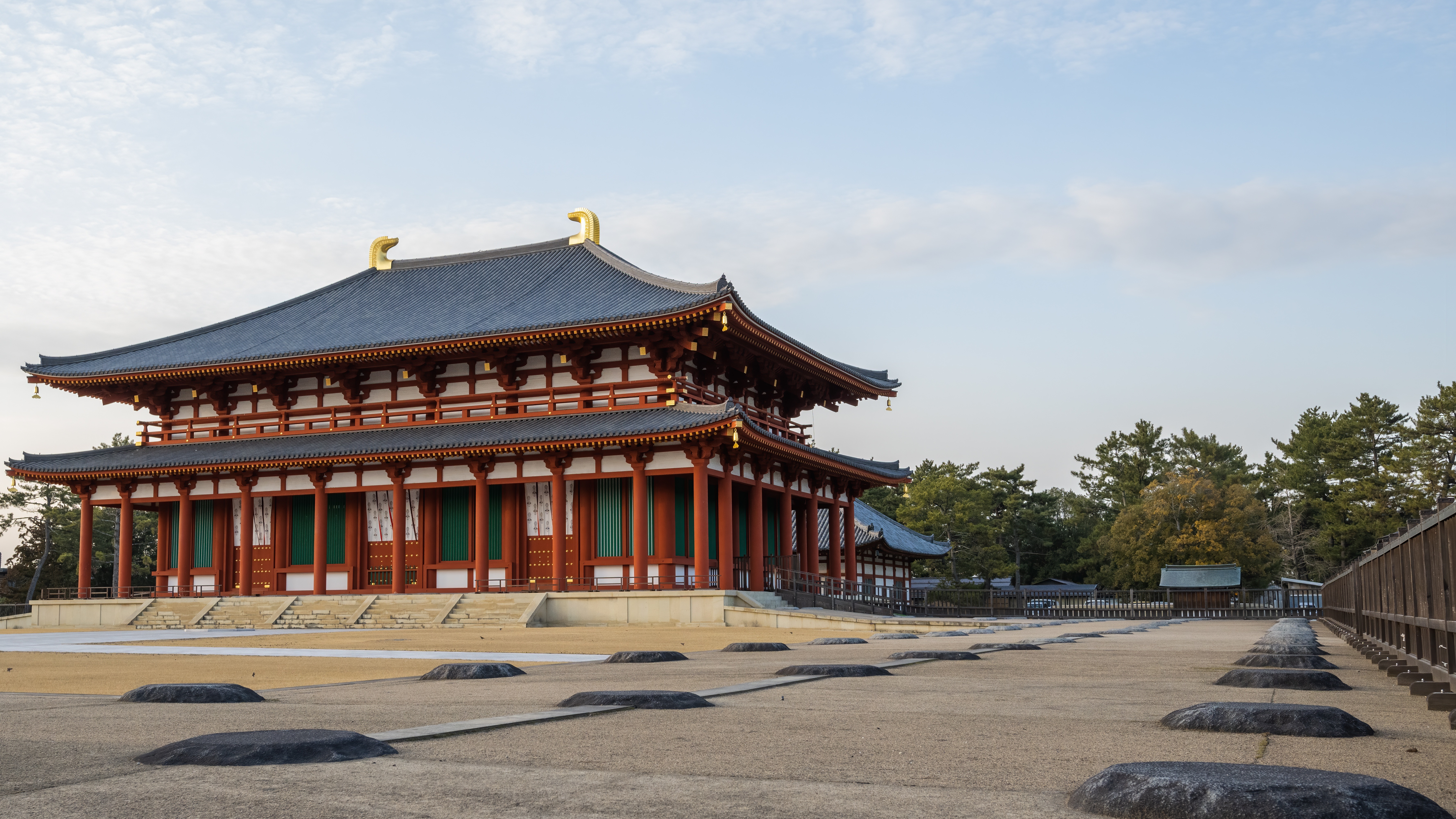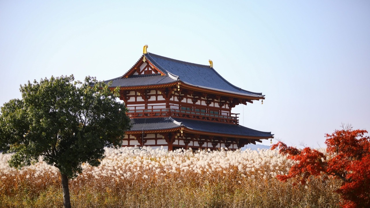 平城宮跡(へいじょうきゅうせき) 1300年前、日本の首都「平城京」の中心だった場所であり、現在は広大な歴史公園として世界遺産に登録されています。復元された豪華絢爛な「大極殿(だいごくでん)」や「朱雀門(すざくもん)」が、かつての都の繁栄を今に伝えています。建物の中を近鉄電車が走り抜ける珍しい光景も見られ、歴史のロマンと開放的な空気を同時に味わえる特別なスポットです。