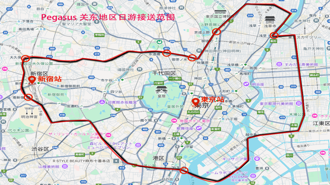 1.新宿区・千代田区・中央区・台東区のホテルでは送迎が可能です。その他のエリアについては、送迎可否の確認が必要となりますので、ご予約時にホテル名と住所をご記入ください。