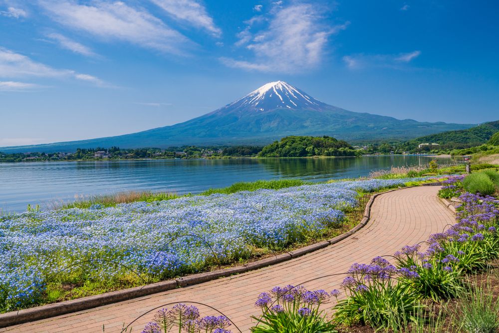 河口湖の北岸に位置し、富士山の絶景と四季折々の花々が楽しめるスポットです。