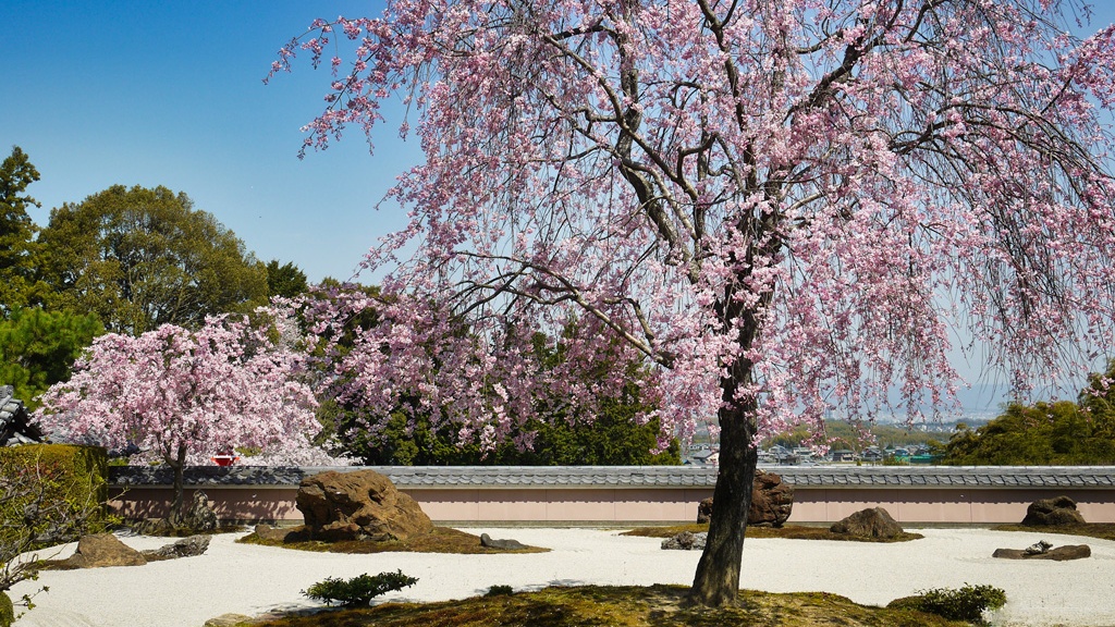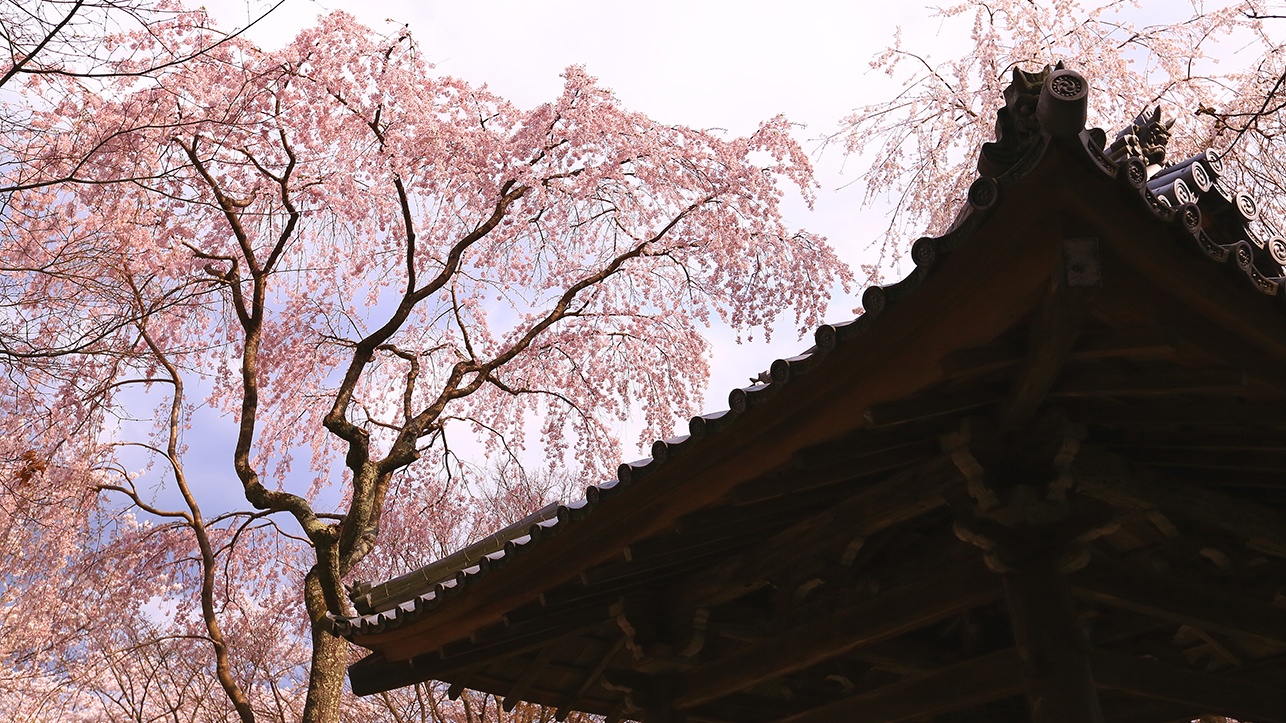 京都西山の中腹に位置する善峯寺は、1029年に創建された由緒ある名刹です。市街地の喧騒から離れたこの場所では、山寺ならではの凛とした空気の中で桜を堪能できます。西国三十三所観音霊場の第20番札所として、多くの重要文化財を有し、古都の深い歴史を今に伝えています。山の斜面を彩るしだれ桜と、日本一の松と名高い「遊龍の松」の共演は圧巻です。境内からは、淡いピンクに染まる山並みと京都盆地を一望できる絶景が広がります。