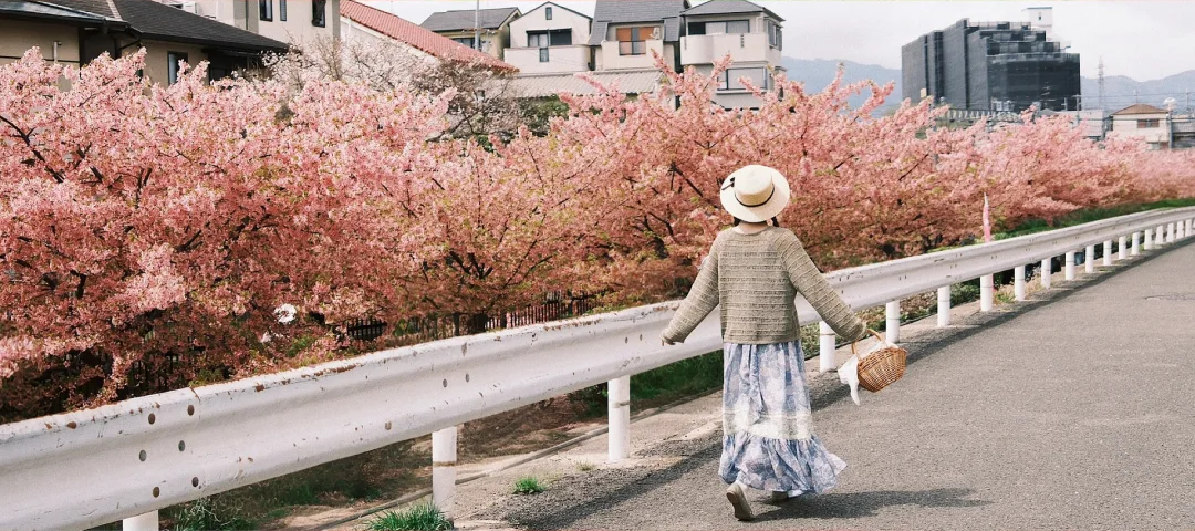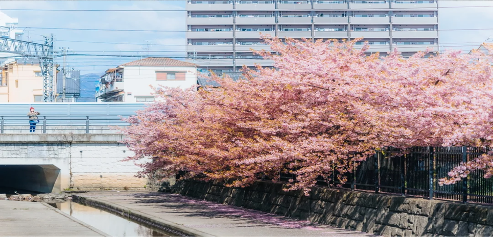 一般的な桜よりもひと足早く咲く河津桜が、川沿いを淡い桃色に染め上げます。