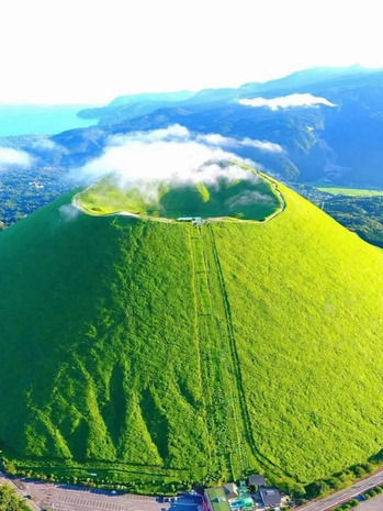 伊豆半島の東側に位置する大室山は、富士山と同じく美しい円錐形をしており、まるで絵画の中に登場するような不思議な山です。標高580メートルの大室山は、噴火によるスコリア(火山噴出物)が積み重なってできたもので、日本のスコリア丘の代表例とされています。山頂の中央には深さ30メートルの火山口があり、空から見下ろすと、山全体がほぼ対称的で完璧な円錐形をしています。その優美な山容は、多くの観光客を魅了し続けています