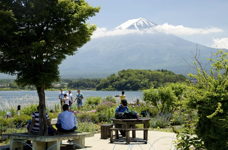 富士山北麓、河口湖の北岸に位置する大石公園は、湖・花々・富士山を一度に楽しめる絶好のビューポイントです。春夏はラベンダーやコスモス、秋はコキアの紅葉、冬は雪化粧した富士山が湖面に映る逆さ富士を楽しめます。園内はコンパクトながらも見どころが凝縮されており、湖沿いの遊歩道からは絵葉書のような美しい景色が広がり、写真撮影や散歩に最適です