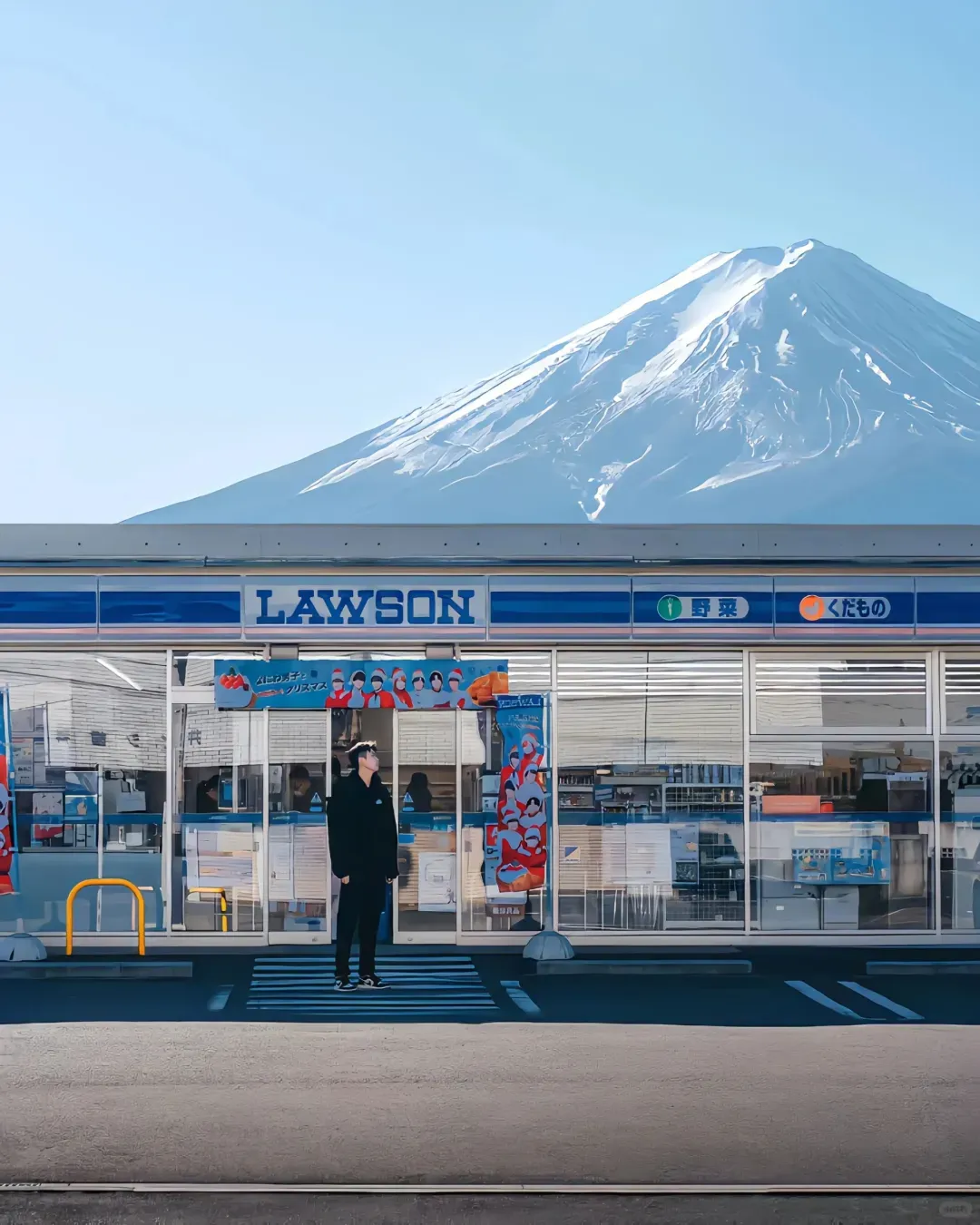 背後にそびえる雄大な富士山とローソンの看板が絶妙にマッチする人気スポットです。撮影の際はローソン向かいの歩道から、モデルと同じ側で構えるのがおすすめ。半身の構図に青めのフィルター(ブルー調)を合わせることで、雰囲気のある一枚に仕上がります。