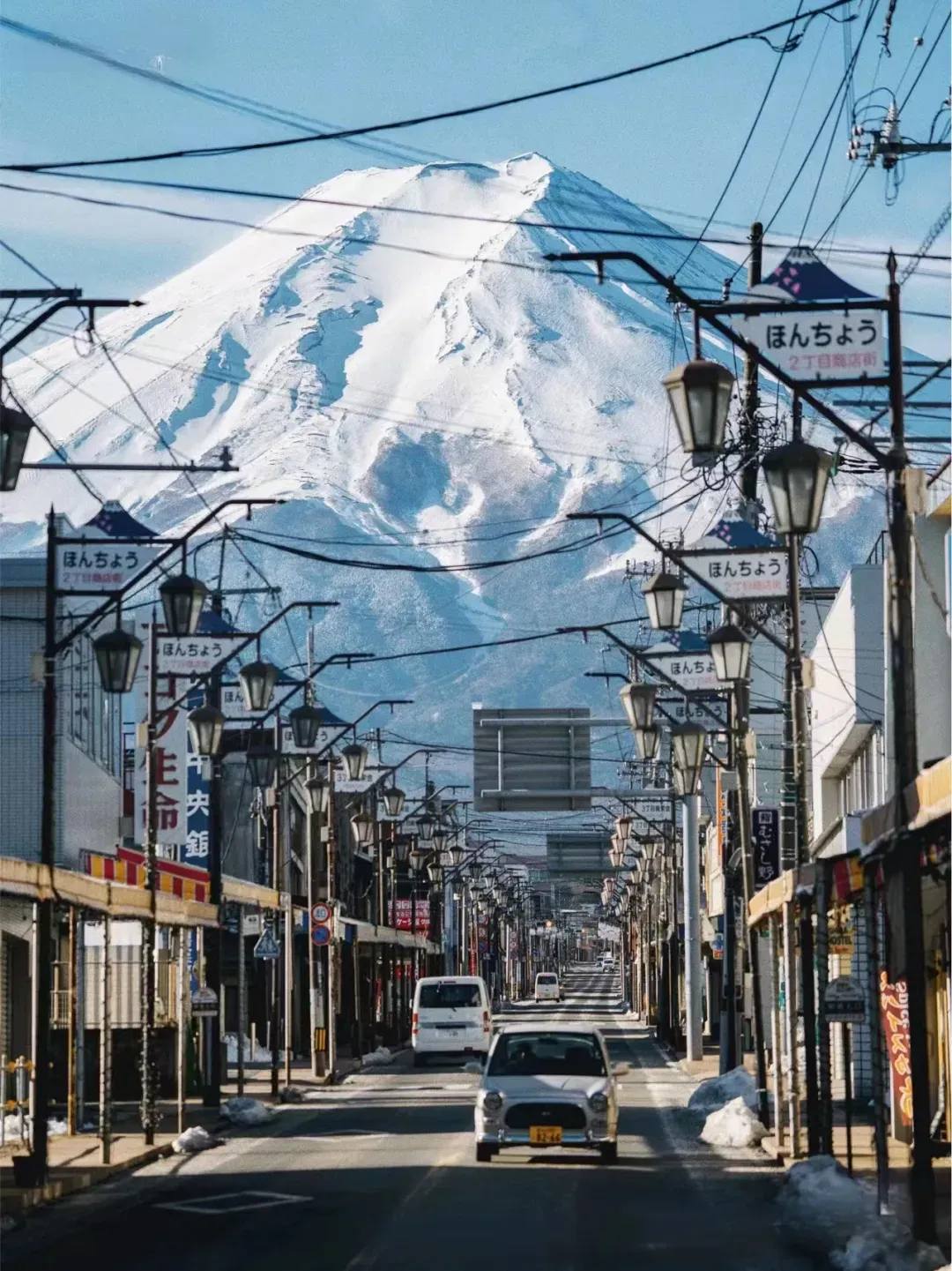 SNSで話題のフォトスポット。富士山へと続く真っ直ぐな商店街の道が、まるで空へと続く階段のように見える場所です。