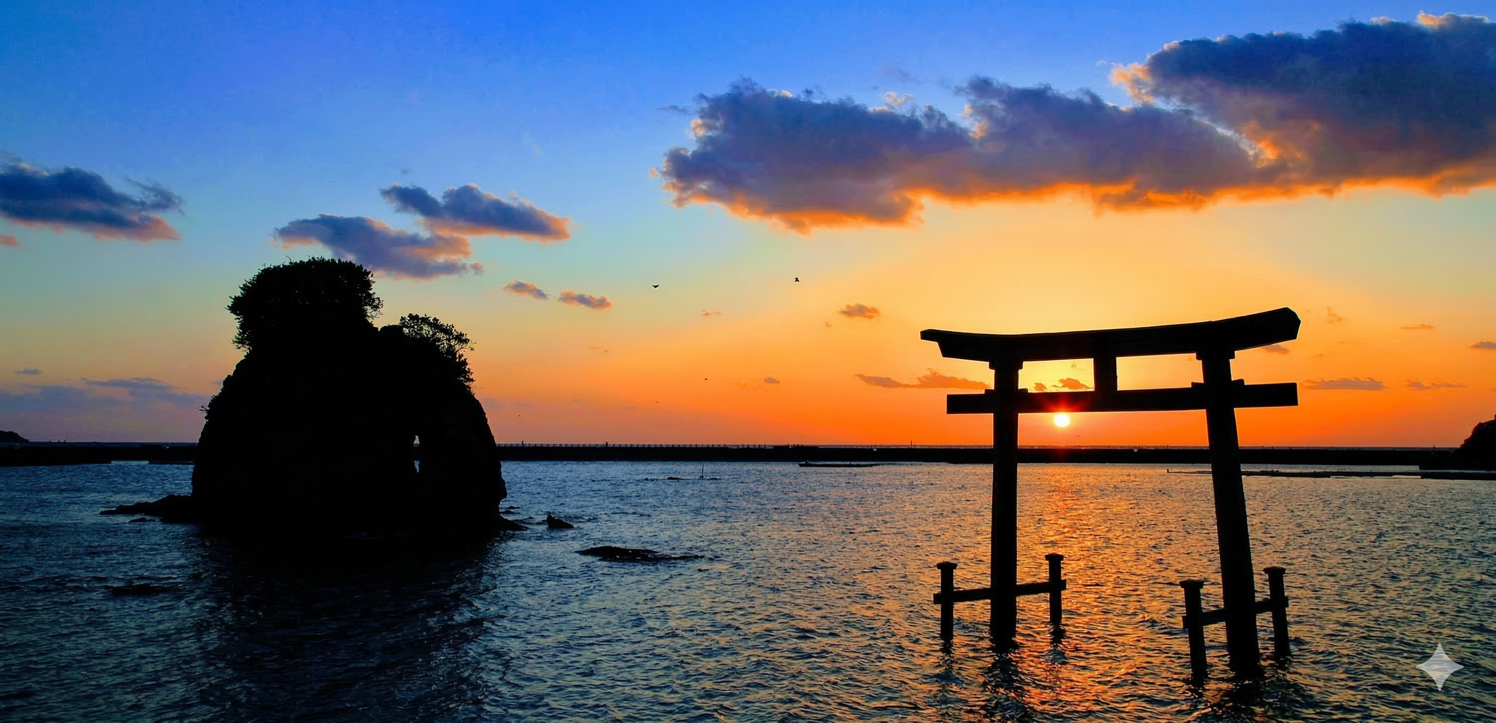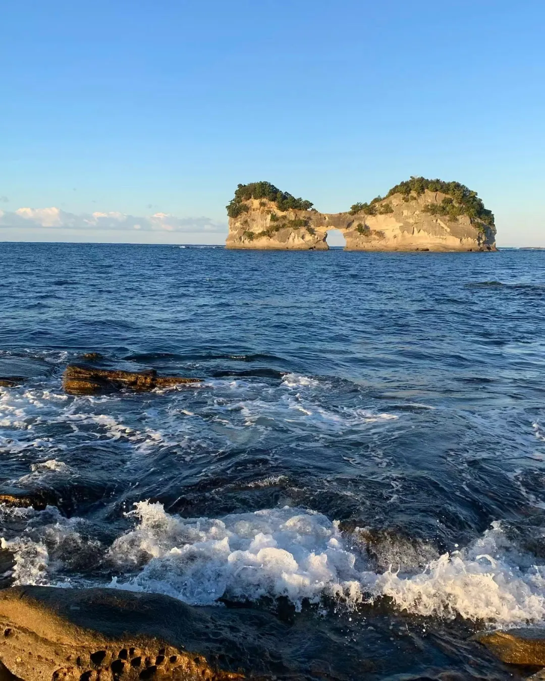 白浜のシンボルとして知られる「円月島(えんげつとう)」、正式名称は「高島」です。島の中央に海蝕による丸い穴が開いており、その形が満月に見えることからこの名がつきました。特に夕景の名所として知られ、穴の中に夕陽が収まる瞬間は、多くの人々を魅了する絶景となります。波の音と夕焼けに包まれたその姿は、太平洋に浮かぶ宝石のように静かでロマンチックです。