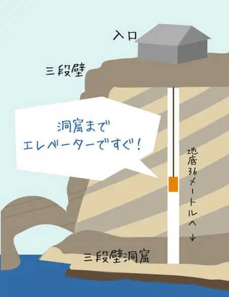 ◎垂直エレベーターで洞窟内へ降ります。
