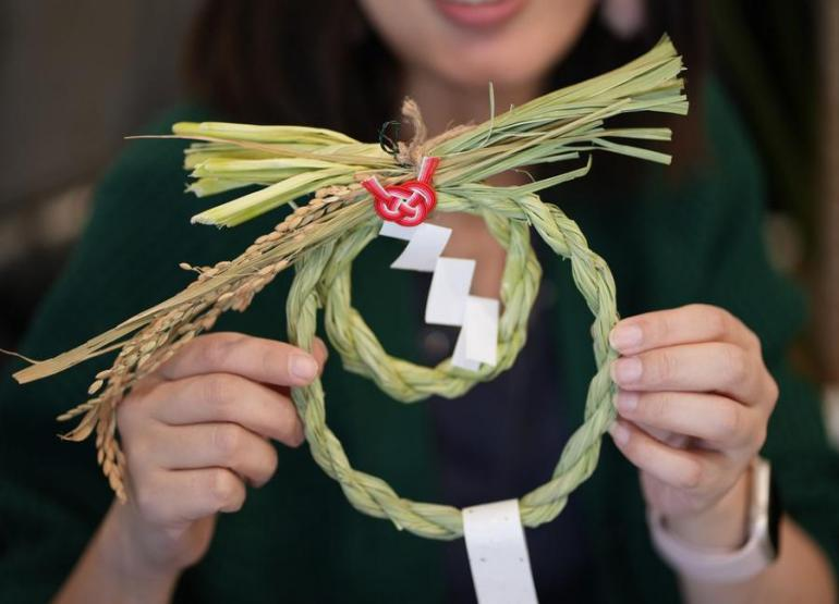 「しめ縄体験」では、スタッフの指導のもと、稲わらを素材として神聖なしめ縄を自分の手で編み上げます。特別な技術は必要なく、初心者の方でも気軽に完成させることができます。